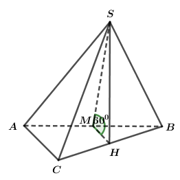 Khi đó \(\left\{ \begin{array}{l}\left( {SAB} \right) \cap \left( {ABC} \right) = AB\\SM \subset \left( {SAB} \right),\,\,SM \bot AB\\HM \subset \left( {ABC} \right),\,\,HM \bot AB\end{array} \right.\) \( \Rightarrow \angle \left( {\left( {SAB} \right);\left( {ABC} \right)} \right) = \angle \left( {SM;HM} \right) = \angle SMH = {60^0}\).