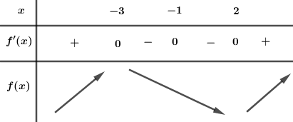 Ta có: \(f’\left( x \right) = 0 \Leftrightarrow \left[ \begin{array}{l}x = 2\\x = – 1\,\,\left( {nghiem\,\,boi\,\,chan} \right)\\x = – 3\end{array} \right.\).