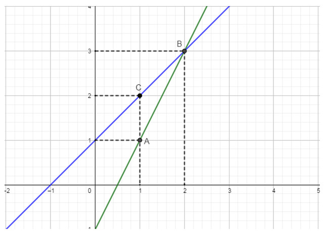 +) Hai điểm \(B\left( {2;3} \right),C\left( {1;2} \right)\) thuộc đồ thị hàm số \(\left( {{d_2}} \right):y = x + 1\)