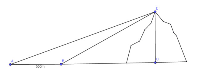 Tính chiều cao của một ngọn núi (làm tròn đến mét), biết tại hai điểm A, B cách nhau 500m , người ta nhìn thấy đỉnh núi với góc nắng lần lượt là \({34^o}\) và \({38^o}\).