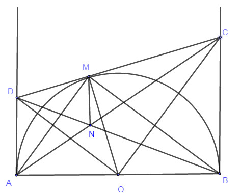 Cho nửa đường tròn \(\left( O \right)\)đường kính \(AB\). Vẽ các tiếp tuyến \(Ax,By\). Từ một điểm M trên nửa đường tròn vẽ tiếp tuyến với \(\left( O \right)\) cắt \(Ax,By\) lần lượt tại DC.