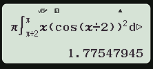 \( \Rightarrow V = \pi \int\limits_{\frac{\pi }{2}}^\pi {x{{\cos }^2}\frac{x}{2}dx} \approx 1,775\).