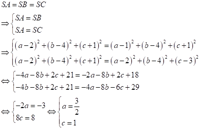 Khi đó ta có: \(S\left( {\frac{3}{2};1;1} \right)\)\( \Rightarrow SA = \sqrt {\frac{1}{4} + 9 + 4} = \frac{{\sqrt {53} }}{2}\)