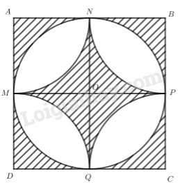 Diện tích phần gạch chéo bằng: \({a^2} – \dfrac{{{a^2}\left( {\pi – 2} \right)}}{2}\) \( = \dfrac{{{a^2}\left( {4 – \pi } \right)}}{2}\,\,\,\left( {c{m^2}} \right)\)
