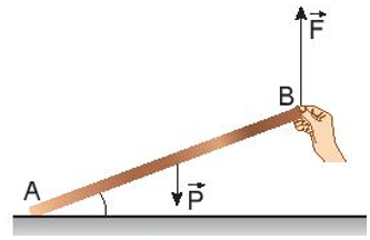 Một người dùng tay tác dụng lực F nâng vật là một thanh rắn đồng chất dài 1 m như hình dưới đây. Biết góc giữa thanh và sàn nhà là 300 và thanh rắn có trọng lượng 20 N. Độ lớn của lực F là