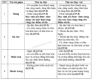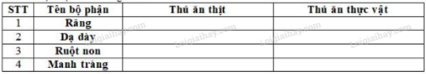 Câu 2 (2,0 điểm). Hãy lập bảng phân biệt về cấu tạo và chức năng của ống tiêu hóa ở thú ăn thịt và thú ăn thực vật theo bảng sau: