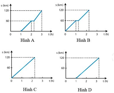 Câu 17: Lúc 1 h sáng, một đoàn tàu hỏa chạy từ ga A đến ga B với tốc độ 60 km/h, đến ga B lúc 2 h và dừng ở ga B 15 min. Sau đó, đoàn tàu tiếp tục chạy với tốc độ cũ thì đến ga C lúc 3 h 15 min. Hình vẽ nào sau đây biểu diễn đúng đồ thị quãng đường – thời gian của đoàn tàu nói trên?