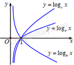 Cho ba số thực dương a, b, c khác 1. Đồ thị các hàm số \(y = {\log _a}x,y = {\log _b}x,y = {\log _c}x\) thể hiện ở hình vẽ dưới đây.