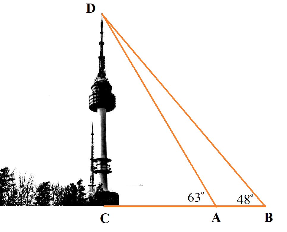 Câu 3: Để đo chiều cao ngọn tháp, người ta đánh dấu hai điểm A, B trên mặt đất sao cho ba điểm A, B và chân tháp thẳng hàng; AB = 100 m. Tại A và B người ta xác định được góc nhìn tháp (như hình vẽ) lần lượt là \({63^ \circ }\) và \({48^ \circ }\). Tính chiều cao của tháp.