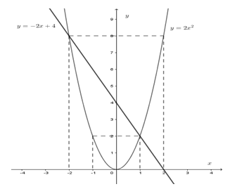 Cho hai hàm số \(y = 2{x^2}\) và \(y = – 2x + 4\).