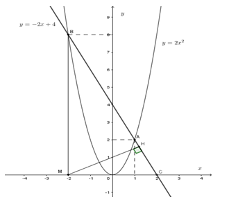 b) Tìm tọa độ hai giao điểm A và B của hai đồ thị đó. Tính khoảng cách từ điểm \(M\left( { – 2;0} \right)\) đến đường thẳng \(AB\).