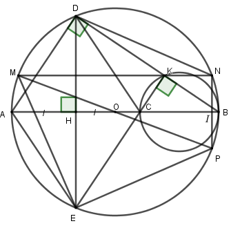 Kẻ đường kính \(MP\) cửa đường tròn \(\left( O \right)\). Nối \(N\) với \(P\) cắt \(AB\) tại \(I\). Nối \(E\) với \(P\), \(E\) với \(B\).