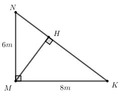 Câu 7 (1,0 điểm). Nhằm tiếp tục đẩy mạnh phong trào xây dựng trường học Xanh – Sạch – Đẹp, trường THCS A đã thiết kế một khuôn viên để trồng hoa có dạng hình tam giác vuông (như hình bên, biết rằng \(\Delta MNK\) vuông tại M, \(MN = 6m,\,\,MK = 8m,\,\,MH \bot NK\)). Nhà trường trồng hoa mười giờ dọc các đoạn NK, MH.