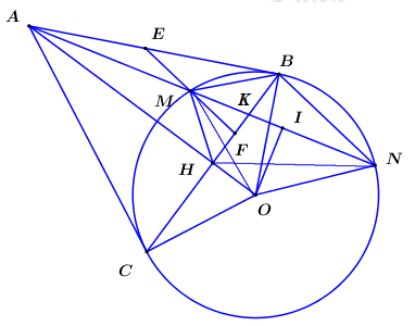 Câu 4 (3 điểm)  Từ điểm \(A\) nằm ngoài đường tròn \(\left( O \right)\) kẻ 2 tiếp tuyến \(AB,\,\,AC\) với đường tròn (\(B,\,\,C\) là các tiếp điểm). Trên nửa mặt phẳng bờ là đường thẳng \(AO\) chứa điểm \(B\) vẽ cát tuyến \(AMN\) với đường tròn \(\left( O \right)\) (\(AM < AN\), MN không đi qua O). Gọi I là trung điểm của MN.