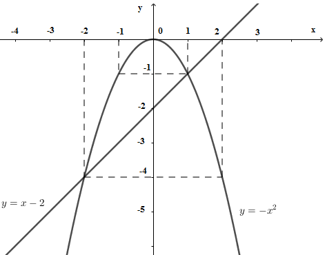 1. Cho parabol \(\left( P \right):y = – {x^2}\) và đường thẳng \(\left( d \right):y = x – 2\)