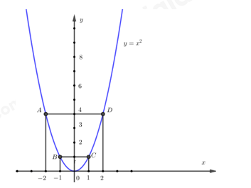 Khi đó đồ thị hàm số đã cho  là 1 đường cong và đi qua các điểm \(A\left( { – 2;4} \right);B\left( { – 1;1} \right);C\left( {1;1} \right);D\left( {2;4} \right);O\left( {0;0} \right)\)