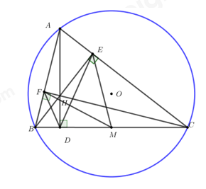 Suy ra tứ giác BFHD nội tiếp được đường tròn đường kính BH với tâm là trung điểm của BH. (tổng 2 góc đối trong 1 tứ giác bằng \({180^0}\)
