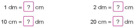 Đổi: 1 dm = 10 cm ; 2 dm = 20 cm; 3 dm = 30 cm.