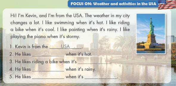 Hi! I’m Kevin, and I’m from the USA. The weather in my city changes a lot. I like swimming when it’s hot. I like riding a bike when it’s cool. I like painting when it’s rainy. I like playing the piano when it’s stormy.