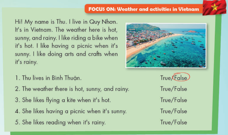 Hi! My name is Thu. I live in Quy Nhơn. It’s in Vietnam. The weather here is hot, sunny, and rainy. I like riding a bike when it’s hot. I like having a picnic when it’s sunny. I like doing arts and crafts when it’s rainy.