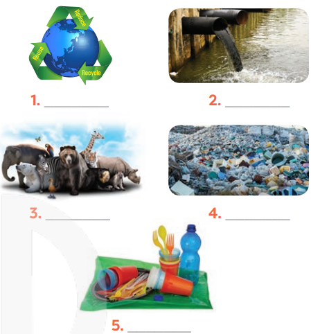 1. Listen and read. 2. Read the conversation again and match the two halves in the two columns. 3. Complete each sentence with one word or phrase from the box. 4. Write a phrase from the box under each picture. 5. QUIZ. Environment Quiz. Do the following quiz.