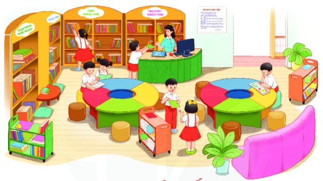 Tranh vẽ cảnh trong thư viện. Có bạn đang đọc sách, có bạn đang tìm sách, cũng có bạn đang trả sách cho cô thủ thư.