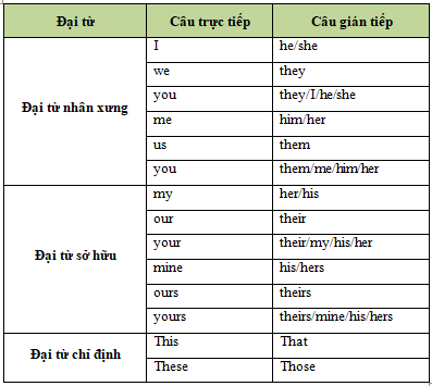 – Các đại từ: Các đại từ nhân xưng và đại từ sở hữu khi chuyển từ lời nói trực tiếp sang lời nói gián tiếp thay đổi như sau: