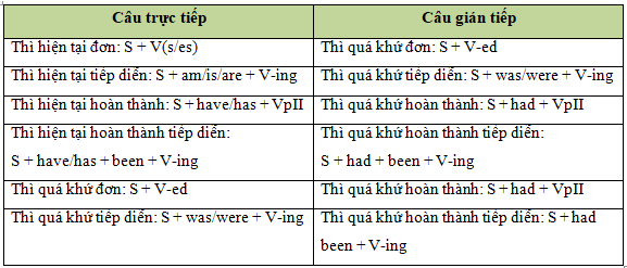 – Thì của động từ: Thì của động từ trong câu gián tiếp thường  lùi về 1 thì khi động từ tường thuật ở thì quá khứ.