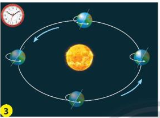 Chỉ trên hình và nói với bạn về chiều chuyển động của Trái Đất quay quanh mình nó và quanh Mặt Trời