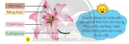 Chỉ trên hình và nói với bạn về các bộ phận của một bông hoa. Hoa có chức năng gì đối với cây.