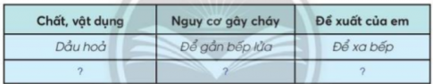 Điều tra những chất, vật dụng có thể gây cháy trong nhà của em và hoàn thành bảng theo gợi ý sau. Chia sẻ với bạn những việc cần làm để phòng cháy khi ở nhà.