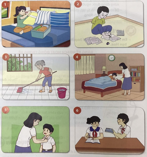 1. Theo em, biểu hiện của tự lập là: hình ảnh 1, 2, 3; biểu hiện chưa tự lập: 4, 5, 6.