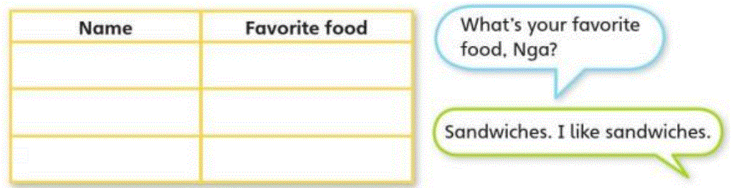 – What’s your favorite food, Lan?        (Đồ ăn yêu thích của bạn là gì, Lan?)