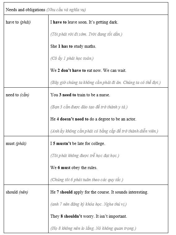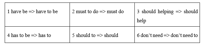 (Hoàn thành bảng với dạng đúng của Have to, Need to, Must và Should.)