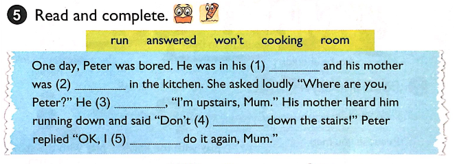 One day, Peter was bored. He was in his (1) room and his mother was (2) cooking in the kitchen. She asked loudly “Where are you, Peter?” He (3) answered, “I’m upstairs, Mum.” His mother heard him running down and said “Don’t (4) run down the stairs!” Peter replied “OK, I (5) won’t do it again, Mum.”