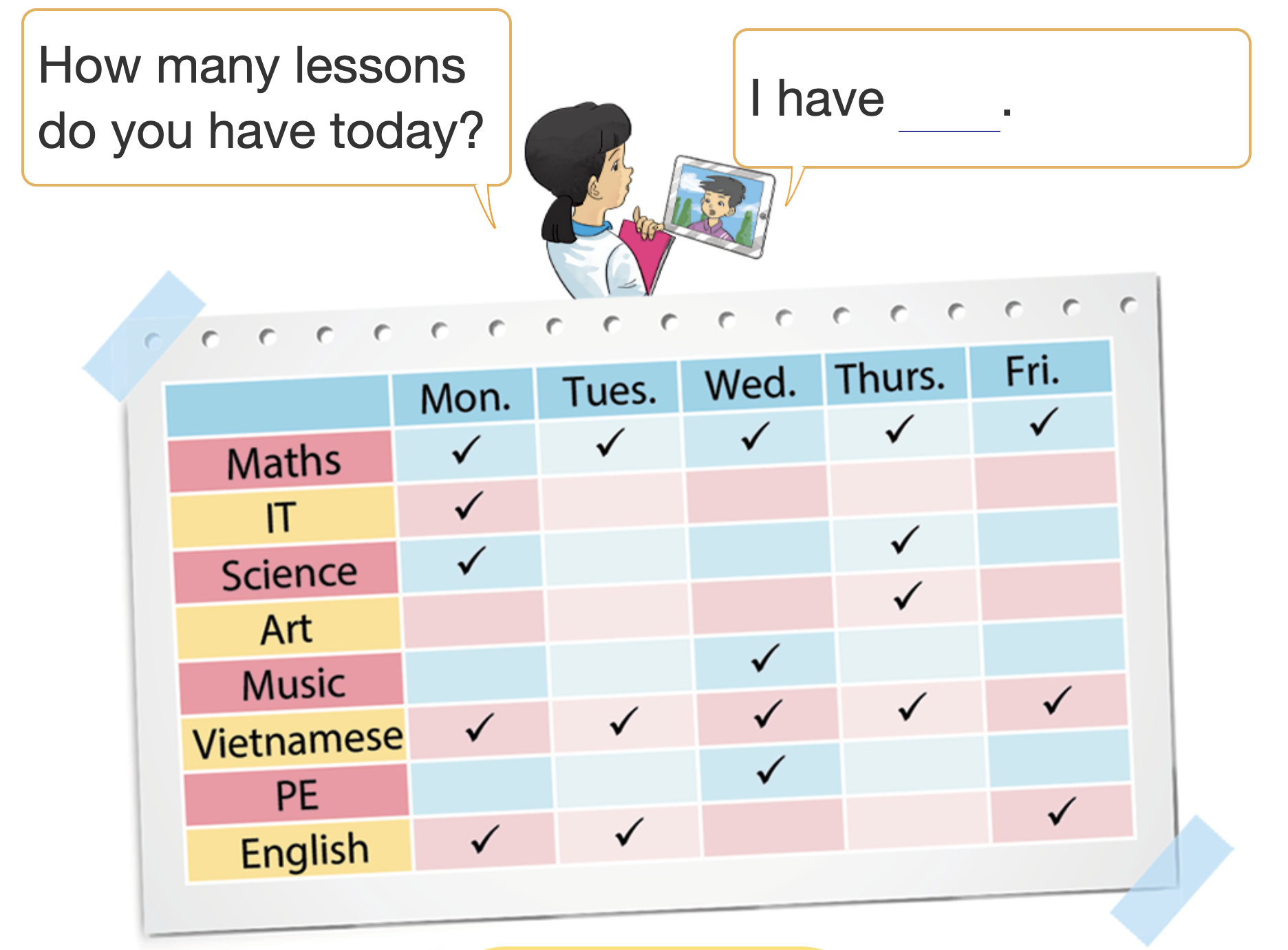 a. How many lessons do you have today? – I have five: Maths, IT, Science, Vietnamese, English.