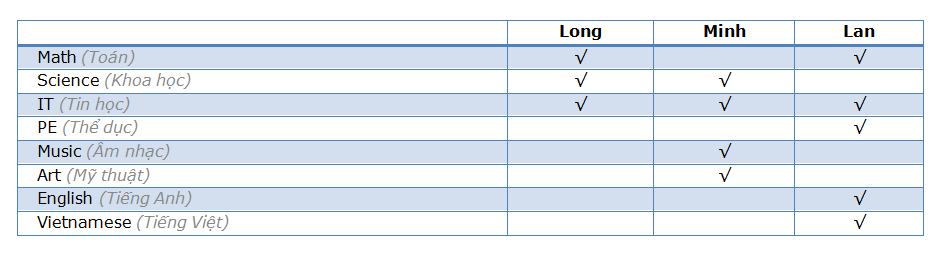 Lan: I have five: Vietnamese, English, Maths, IT and PE.