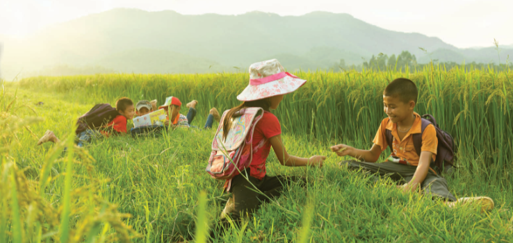 In the picture, children are playing in the field. Children in the countryside can play some games such as kite flying, skipping rope, shooting marbles…