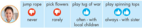 I like to play jump rope and tug of war because I can play them with everyone. I don’t like picking flowers because I think it’s boring.
