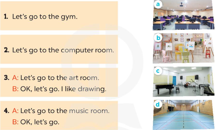 4. A: Let’s go to the music room. (Hãy cùng đến phòng âm nhạc nào.)