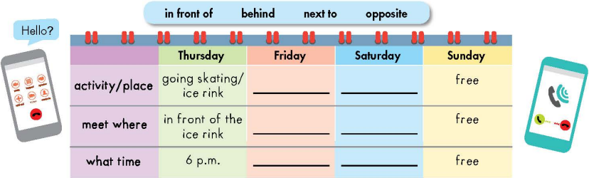 (Làm việc theo cặp mới. Hỏi bạn đồng hành họ sẽ sắp xếp làm gì với bạn của họ, họ sẽ gặp nhau ở đâu, khi nào.)