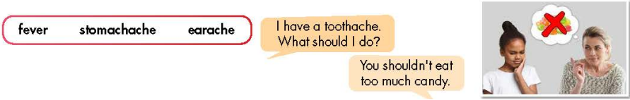 New Words a. Number the pictures. Listen and repeat. b. In pairs: Discuss more health problems and advice and note them down. Listening a. Listen to Jacob visiting the doctor. Circle the reason for Jacob's visit. b. Now, listen and fill in the blanks. c. What do you do when you're sick? Why? Grammar a. Listen and repeat. b. Use the prompts to give advice for each problem. c. Fill in the blanks using should or shouldn't. d. In pairs: Ask for and give your partner advice using the prompts.