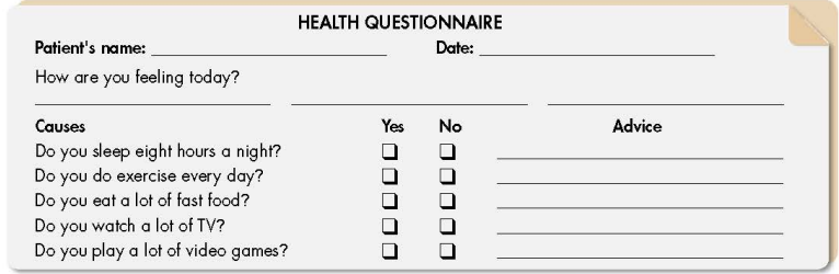 a. In pairs: Student B, page 118 File 2. Student A, you’re a doctor giving advice to a sick patient. Ask your patient questions, complete the questionnaire, and give advice if you need to for each question.