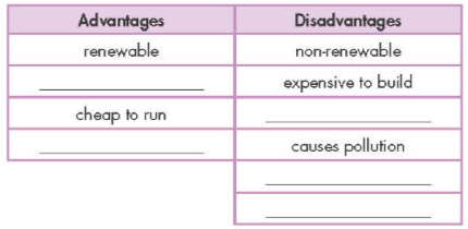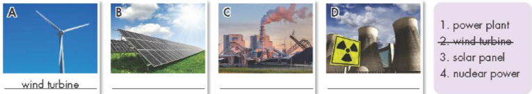 a. Match the words with the pictures. b. Add each word/phrase (5–9) to the correct column. Listen and repeat. c. In pairs: Discuss which energies you think are clean to run or cause pollution.a. Read the text and underline the correct title. b. Now, read and answer the questions.c. In pairs: Which of the energy sources is the best choice for the future of your country?a. Listen and repeat.b. Write sentences using the prompts.c. Fill in the blanks using “and or , but”.d. In pairs: Make sentences