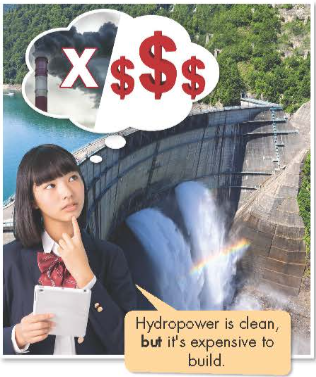 B: It’s clean and cheap to run, but it’s expensive to build. It’s also need big rivers.