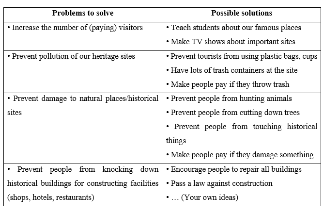 (Theo cặp: Chọn một địa điểm di sản thế giới từ bên dưới hoặc một địa điểm khác mà bạn biết. Liệt kê các vấn đề có thể xảy ra mà địa điểm có thể gặp phải, ví dụ: không nổi tiếng, ô nhiễm, hư hỏng, v.v. Thảo luận về cách tốt nhất để giải quyết những vấn đề đó để bảo tồn địa điểm tốt nhất.)
