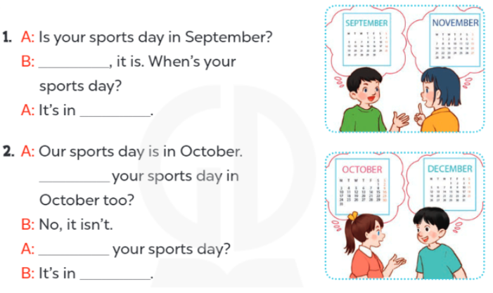 1. A: Is your sports day in December? (Ngày hội thể thao của bạn vào tháng 12 phải không?)