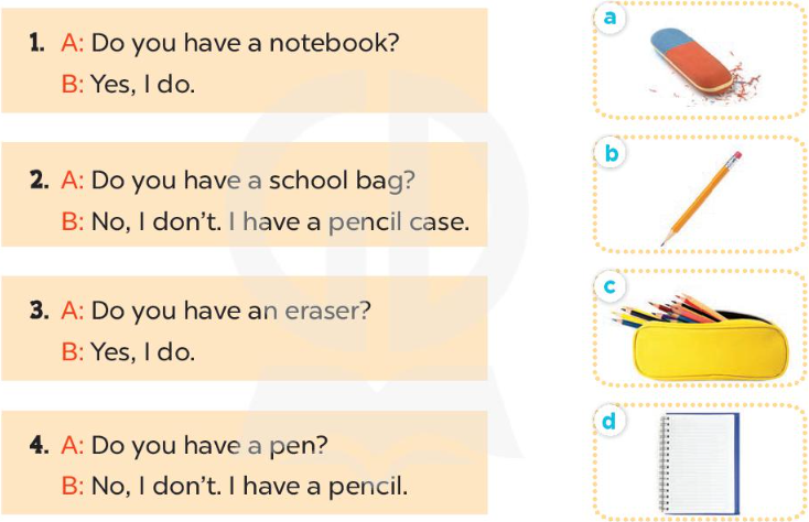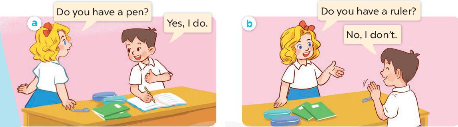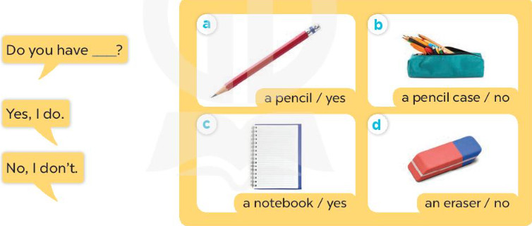 b. Do you have a pencil case? – No, I don’t. (Bạn có hộp bút không? – Không, tôi không có.)