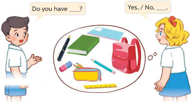 1. A: Do you have a pencil case? (Bạn có hộp đựng bút không?)