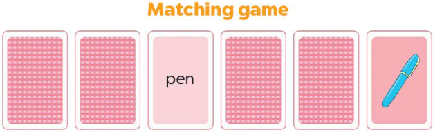 Cách chơi: Lật 2 thè bất kì, phải nhớ những thẻ đã được lật là gì để tìm từ vựng tương ứng với hình ảnh. Ví dụ, lật thẻ có từng vựng là “pen”, thì phải tìm thẻ có hình là cây bút mực tương ứng.